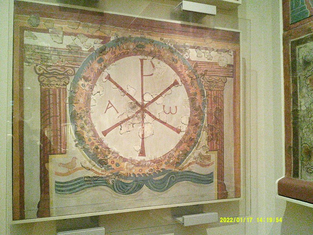 Next there is this mosaic of the Christian symbol, the Chi-Rho, which is currently displayed in the British Museum and came from a Roman villa in Kent, the home of a wealthy Christian family. ‘One of the most incredible discoveries of Lullingstone Roman Villa is the remains of an early site of Christian worship in the form of a house church’. The room used for the church was separate from the family’s dwelling and the Chi-Rho mosaic was part of the wall decorations.