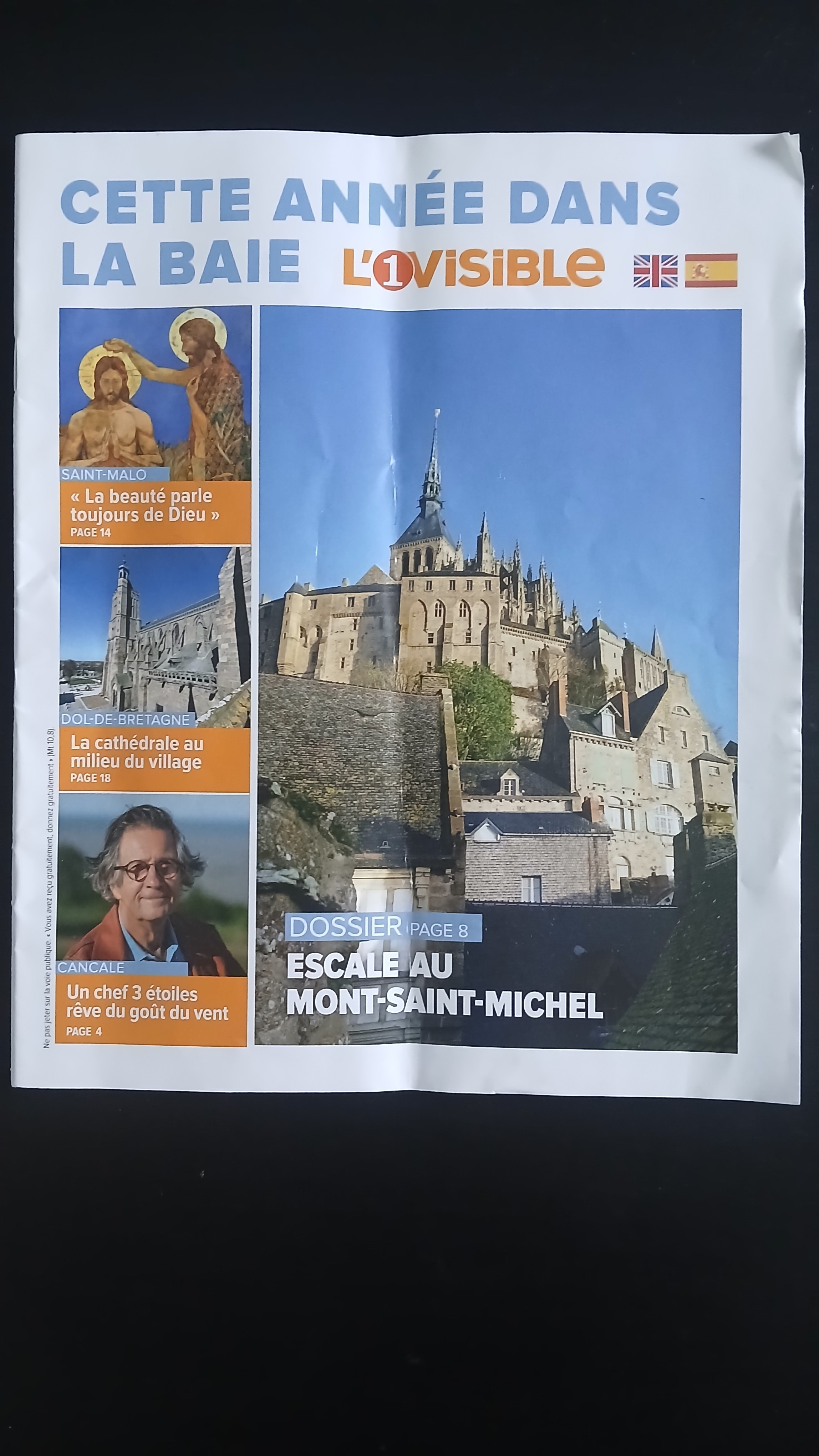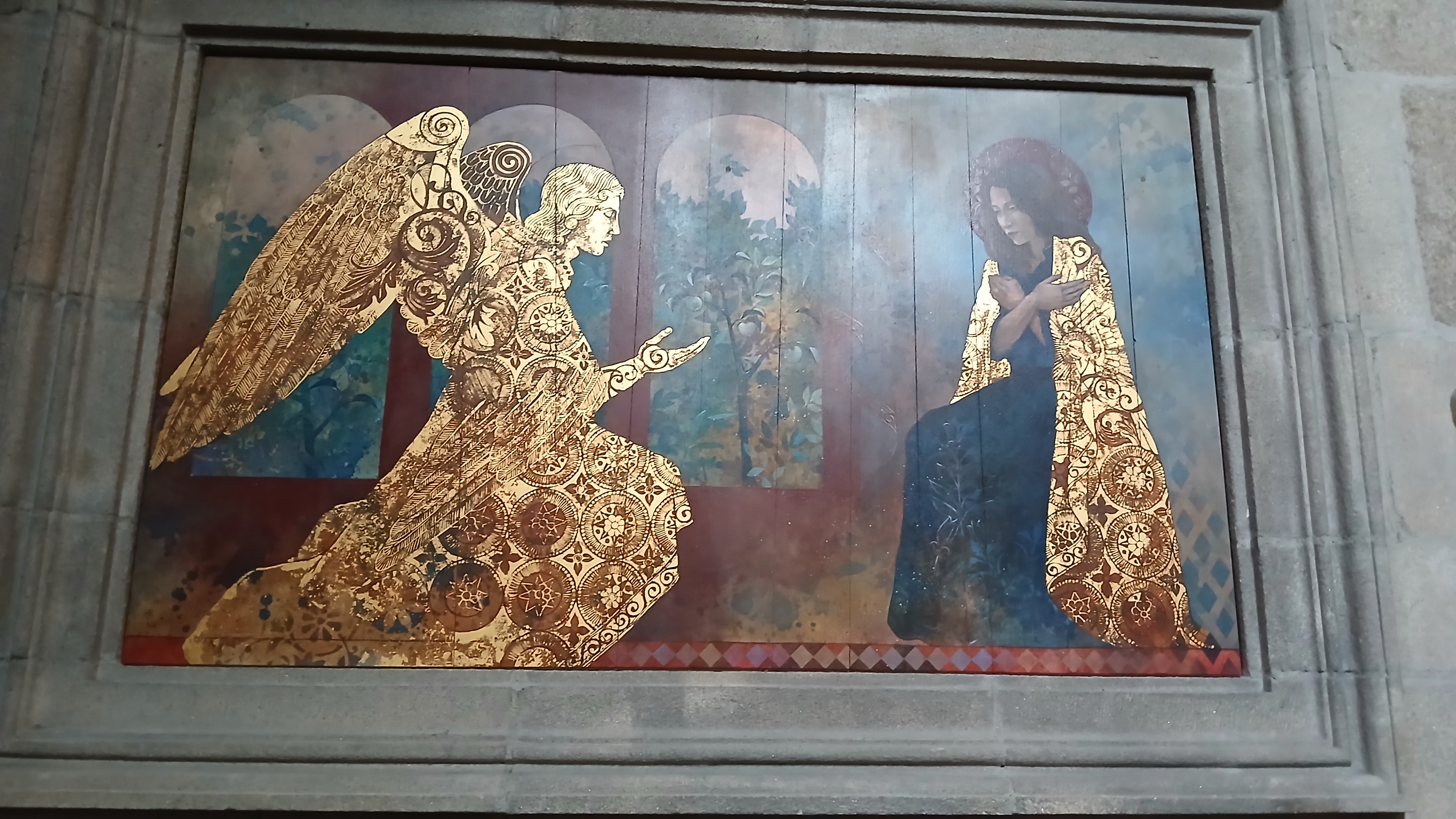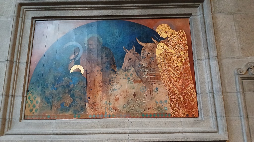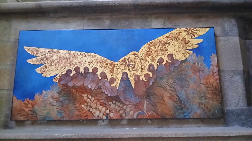 This is a brochure I picked up in the cathedral of St Malo in Brittany, Northern France. St Malo is a beautiful medieval walled city, and outside the city walls is the busy port and ferry terminal, a destination for both freight and tourists. The Cathedrale Saint Vincent-de-Saragosse was built in the 1150s/60s in the Romanesque and Gothic styles. When I visited last September there was a display of seven paintings by artist Augustine Frison-Roche, who explains ‘Beauty, whatever it may be, always speaks of God.’ The paintings depict the life of Jesus from the Annunciation and finishing with the Apocalypse. Here’s four of them; I particularly like the way the gold paint shone out in the low light of the cathedral interior.