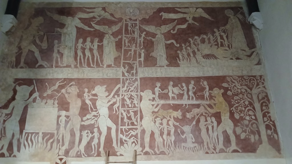 Lastly there’s this scary mural of the Last Judgement on the wall of the 11th century St Peter and St Paul’s Church in Chaldon. The 12th century painting covers most of the west wall and is believed to be the work of a travelling monk. It depicts the ‘Ladder of Salvation of the Human Soul’ and ‘Purgatory and Hell’. The painting was intended as a visual aid to accompany religious teaching – it would certainly frighten the congregation into behaving themselves!