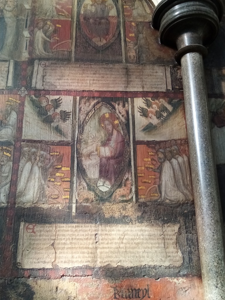The parish church of All Saints was built in the 12th century, but even before its construction, the first ‘true’ King of England Athelstan was crowned at a former church, probably wooden, on this site. Athelstan united the Kingdoms of Wessex and Mercia and it is here that Church and Crown formally agreed to support each other. Athelstan’s coronation service laid the foundations for all coronation services since then, and Athelstan was the first monarch to have a crown placed on his head rather than a helmet. Nine centuries later, the church has been substantially altered and enlarged, with very little of the original building remaining. During 19th century restorations an original Norman door was uncovered but was considered too fragile to preserve and was destroyed. I don’t think that would happen today! Today the church is busy preparing for the 1,100 year anniversary celebratory events, one of the most exciting is the formal unveiling of seven embroidered panels of the seven kings. Four of these are already in situ in niches, the others are being completed, and the unveiling ceremony will be on September 4th – I’m hoping to go along! I wasn’t able to take many pictures of the interior because there were dozens of people there, but here are my favourite things in the church.