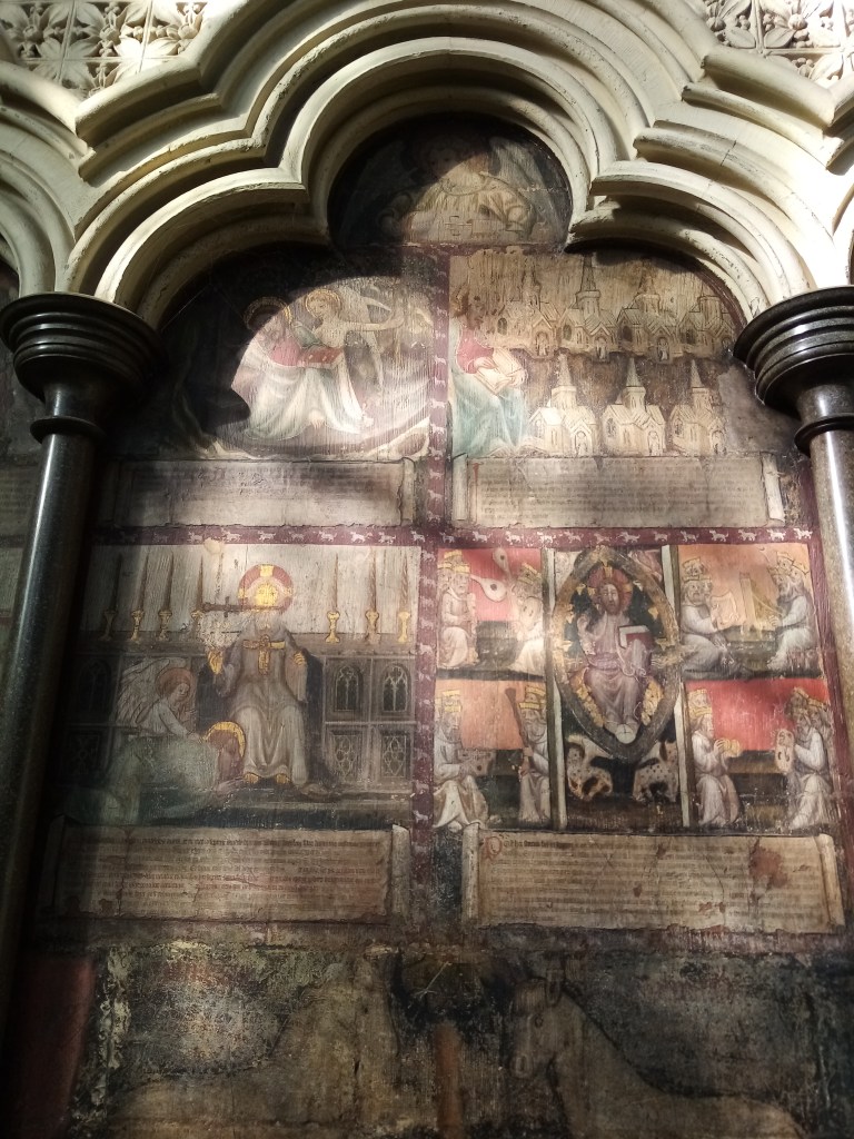 Most of these wall paintings were painted in around 1400 in the ‘International Gothic Style.’ They were commissioned by one of the monks of Westminster Abbey and are remarkably well preserved considering alterations made to the Chapter House in the 16th and 19th centuries. The murals show scenes from the Apocalypse: visions from St John in the Book of Revelation and originally there were 96 painted around the octagonal room. The high quality artwork uses expensive pigments and glazes including gold and tin leaf.