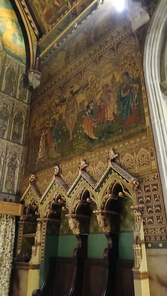 If only that Tunnel had still been in use, it would have been an exciting route from St Mary’s to St Peter’s just across the River. As it was, I travelled one stop on the Windrush Line. This church has a legacy of caring for the poorest people of the dockland area, with the first Anglican mission to the poor of London being founded here by members of the Society of the Holy Cross. Wapping was one of the poorest districts, inhabited by criminals, prostitutes and unskilled dock workers. Work began on the building of the church in 1856 by the Reverend Charles Lowder, and the church was consecrated in 1866. Soon afterwards the East End was struck by cholera and Rev. Lowder, the other clergy and the Sisters of Mercy worked tirelessly caring for the sick at great personal risk. Thereafter Rev. Lowder was called ‘the Father’ by local people as he seemed like the father of the community. The work among the poor continued with the setting up of schools and clubs for children, canteens offering affordable food, and spiritual support. In 1873 Lincoln Stanhope Wainwright became Rector of St Peter’s under Rev. Lowder and continued the parish work, even giving away his own food and clothing to the destitute. Another priest beloved by the community, when he died in 1929, one of his parishioners wrote ‘Docklands was washed with tears because this tiny but indomitable figure, shabby, untiring, spendthrift of love, would not serve them on Earth any more.’ I loved St Peter’s bright, colourful interior.