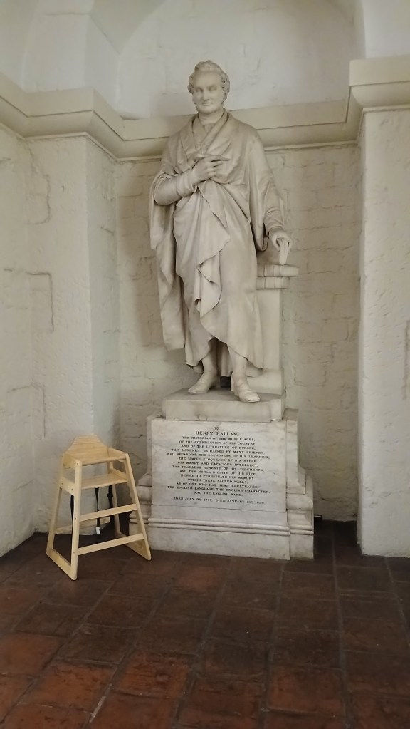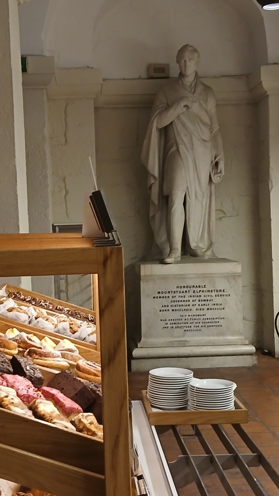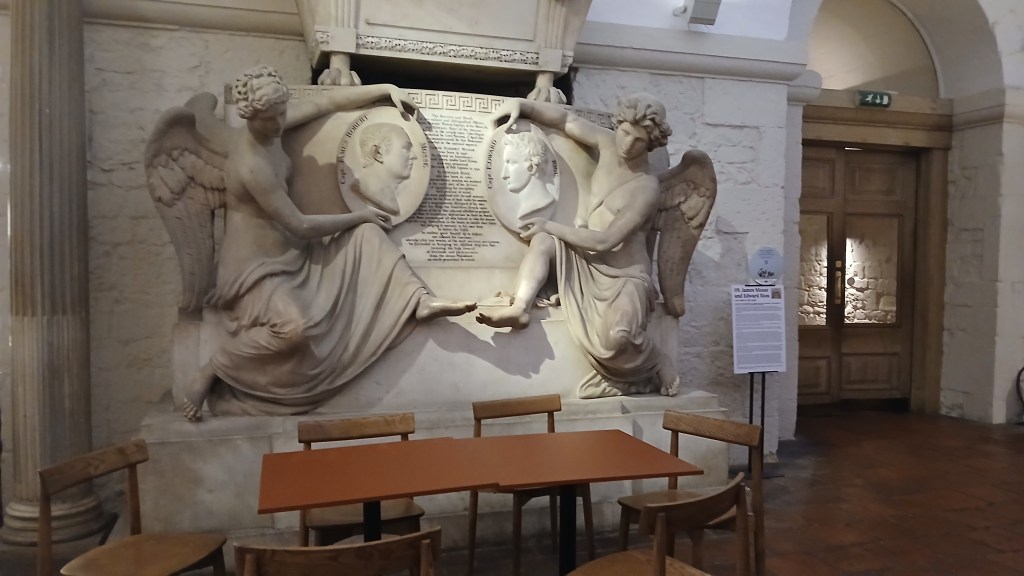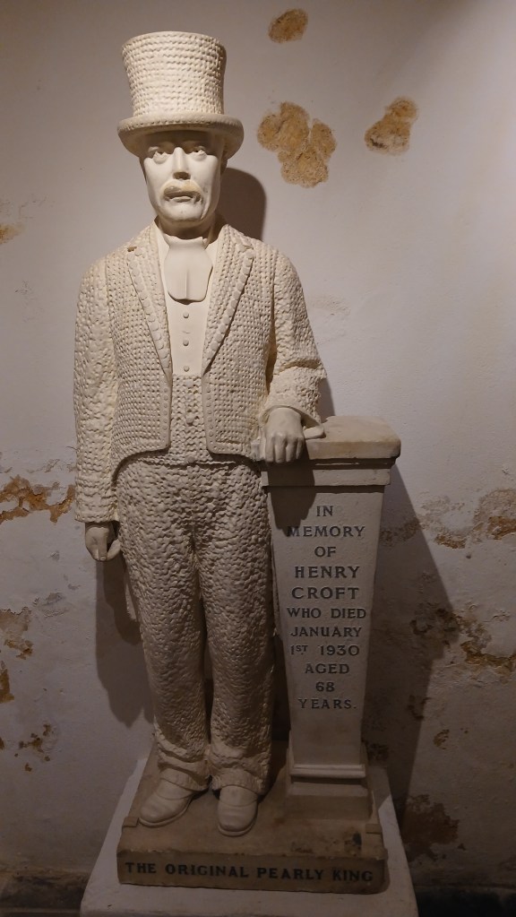 The Café in the Crypt below St Martin is a long-established and very popular eating place, just off Trafalgar Square. A circular lift inside a spiral staircase takes you down to the crypt with its shop, brass rubbing centre and the café with its vaulted brick ceilings. The café has secluded alcoves and historic tombstones right under your feet, dating back to when the crypt was a place of burial. It serves substantial breakfasts and lunches and snacks. I thought a freshly brewed flat white and an almond croissant for £6 was exceptional value for this part of London. If I’d wanted a more substantial meal, there was lots of choice, including fish and chips, macaroni and broccoli cheese, and chicken tikka. Also available are hot and cold puddings and fruit. also in the crypt is the Gallery, displaying artwork and monuments from the church above, and this intriguing statue of London’s first Pearly King.