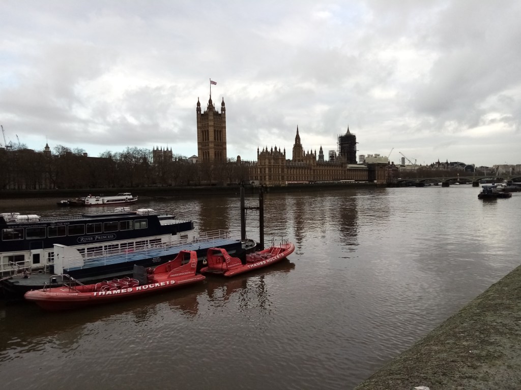 The boats are tied up at the end of the Pier, showing the short boat ride to the Houses of Parliament on the North Bank.