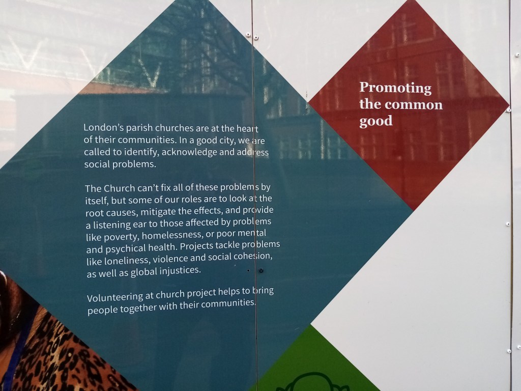 Conclusion: I’ve walked round this area twice now, and both times I really had a sense of the presence of God. I’m not saying that SE1 doesn’t have any crime, or drugs, or family breakdown, but I sensed God’s love at work here. The local church (or palace!) is ‘a vital and living part of the metropolis, committed to maintaining a presence’, as it says on the hoardings. Isn’t that what Jesus himself did, going from place to place, being visible to ordinary people and changing their lives?
