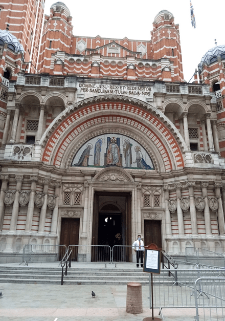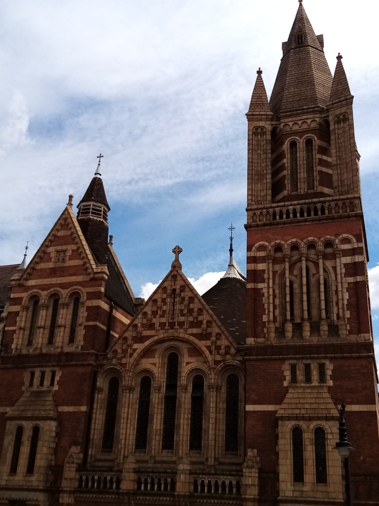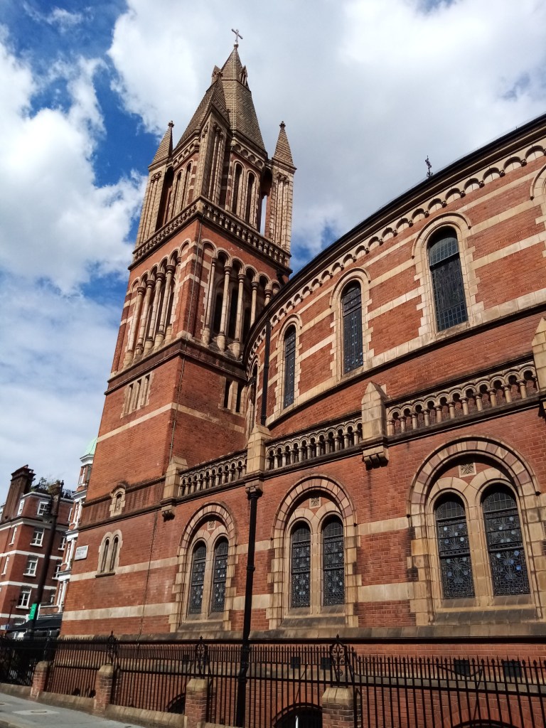 The Ukrainian Holy Family Catholic Cathedral is located just behind Oxford Street, I wonder how many shoppers realise it’s there! It was built in 1891 by architect Alfred Waterhouse in the Romanesque Revival style and was formerly the Congregational King’s Weigh House Chapel. The Congregationalists sold it to the Ukrainian Catholics in 1967 and it became their headquarters. It might seem too large a building for one immigrant nationality group but there are have been large Ukrainian communities in London and Manchester since the late 19th Century. The curious thing about the building is that there is absolutely nothing to indicate what the building is used for: no notice board, posters, signs on the doors. Behind the locked iron gates were the familiar Covid-19 H &S notices, in English and Ukrainian, but nothing about services or activities. The other interesting thing is its strong resemblance to Westminster, a similar stripyness! (Spellcheck doesn’t know that word, by the way.)