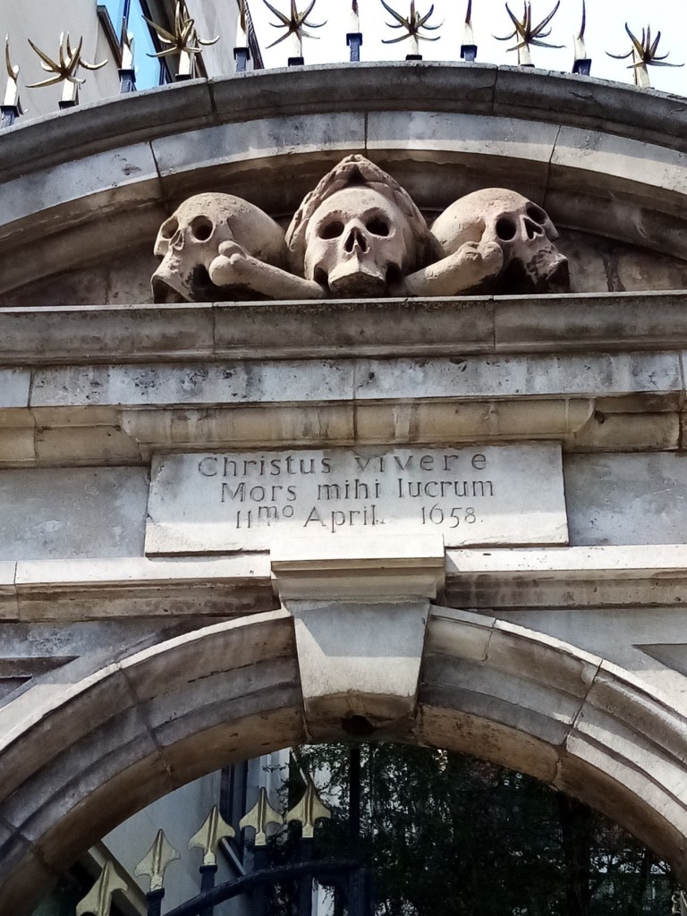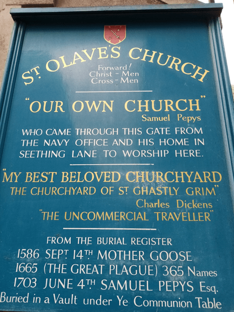 St Olave’s Church is the smallest intact medieval church in the city of London, the first building dating from the 12th Century and the current building from the 15th. St Olave’s has associations with Samuel Pepys (the Navy Office where he worked was nearby and his house was in adjacent Seething Lane) and Charles Dickens, who used the churchyard in one of his lesser-known works – with a somewhat different name! (see pic of noticeboard). Pepys was buried here in 1703, also 365 plague victims, and in 1586, Mother Goose! Who was she, I must Google that! The entrance to the churchyard is under an arch of skulls and bones, rather morbid to us today but signifying Life after Death. Seven years after the skulls were carved, the devasting Black Death gave a new significance to the sculpture.  Another year of devastation followed, with the Great Fire of September 1666 destroying most of the City and surrounding area. St Olave’s survived, partly due to the ingenuity of Pepys who had many of the wooden structures surrounding it removed.