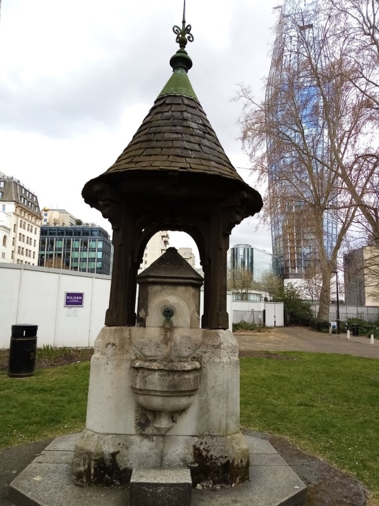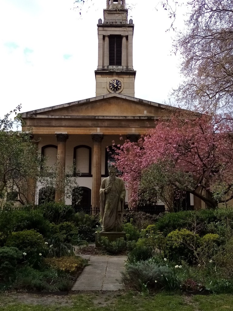 This small garden is the remains of the much larger Medieval Paris Garden mentioned in Shakespeare’s play Henry Vlll. The original Christ Church was built in 1671 but it began to sink into the boggy ground near the riverbank and had to be rebuilt in 1738. That one was destroyed by World War 2 bombing and the current church dates from 1960. The churchyard was closed to burials in 1856 and converted to a public garden in 1900. The most interesting thing about the churchyard is that when the church was bombed in April 1941, the cross on its roof caught fire and fell onto the grass, scorching the grass. Stones have been placed to mark the place where the burning cross fell. Dramatic!