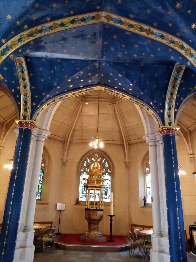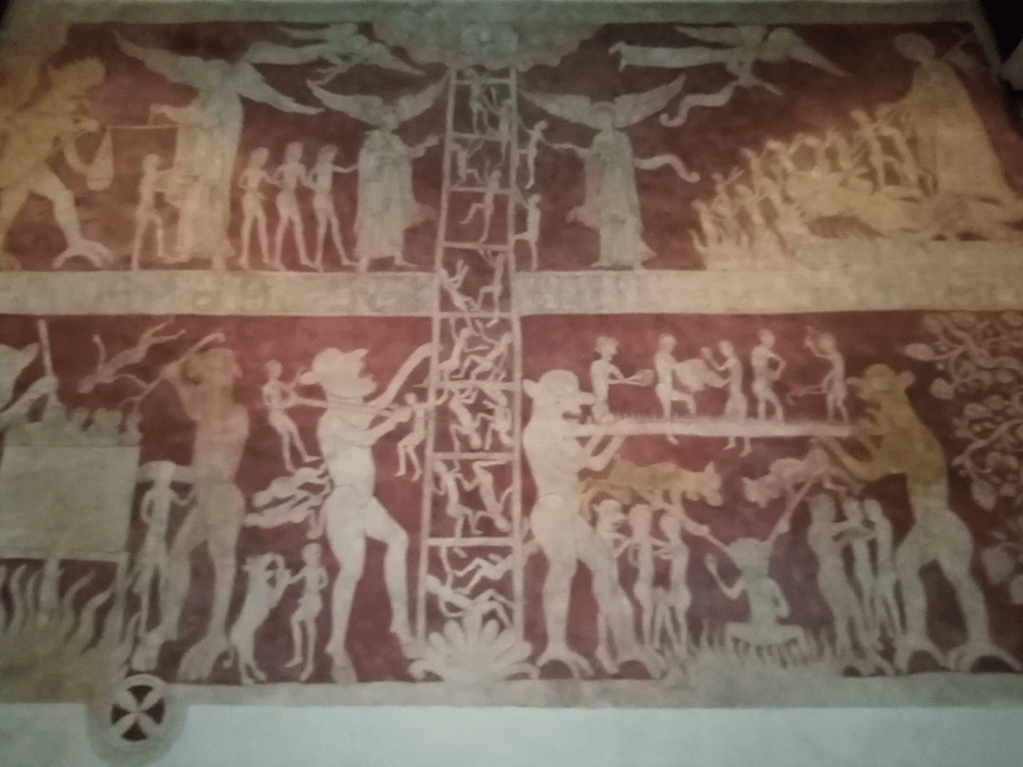 I have to admit, I’m rather obsessed with this church, having visited it in every season and I even have a jigsaw made of it! This little church sits on a hill surrounded by fields and country lanes and has a beautiful churchyard. A Chaldon Church of Saxon Foundation is recorded on the site in 727AD, and the present church was begun in the late 10th century, before the Norman Conquest, and a substantial part this building still stands. St Peter and St Paul’s is famous worldwide for its twelfth century ‘doom mural’ on the west wall, described as ‘perhaps the most interesting ancient wall painting in England.’ The mural depicts the Last Judgement and purgatory and consists of a background of red pigment mixed with egg yolk to make a permanent, fast-drying painting medium which can last for 2,000 years. The figures are in a cream colour which is unusual. The top half of the mural shows the judgement and salvation of souls, and the lower half has demons and souls which have descended into Hell. The ladder in the middle shows mortal souls climbing up to Heaven or falling off down into Hell. All very graphic and terrifying, presumably intended to frighten the congregation into obedience! The contrast with the identity of the church today couldn’t be more striking: there is a strong sense of mission for justice and equality and of love and care of others, evidenced by posters and tree-hangings around the church.