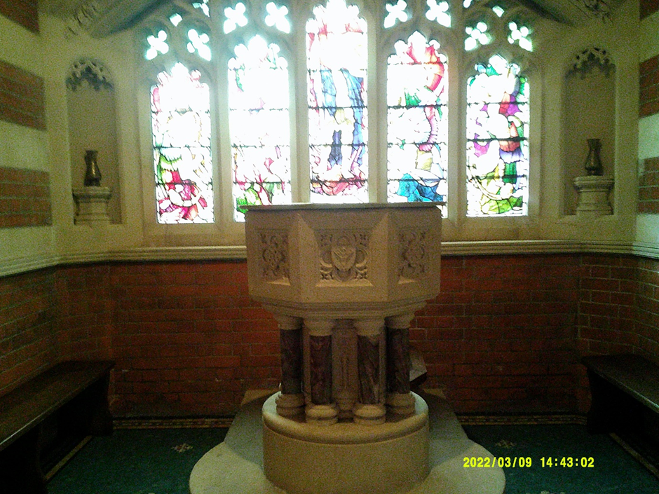 And now, a church built and consecrated 950 years after the first church in Croydon! St Mark’s was built in response to rapid urban growth in the mostly still rural area of South London, an answer to the need for the housing developments of Woodcote and Purley. The church was consecrated in 1910, replacing an earlier temporary building. As a new C of E church, not yet established in the community, it was decided that St Mark’s should be neither ‘High’ nor ‘Low’ church, but Evangelical in its services and outreach. Although St Mark’s was established to serve its upper- and middle-class community, the very first appointed minister arranged for regular church services to be held from a cart drawn to the poorer streets in the town of Purley so that the poorer townsfolk could hear the Gospel preached. Not too many poorer streets in Purley now! An unusual feature of the church is that it has what I call an ‘outside’ bell tower: the bell is in a little tower of its own on top of the church. The church website says, on the history of the building: ‘The plan had included a tower and steeple (with a ring of six bells) on the north side but that proved to be far costly than anticipated.’ So I assume this little tower with its single bell was built instead. The church has some nice stained-glass windows, including one dedicated to Edmund Harrison, who donated the land the church is built on.