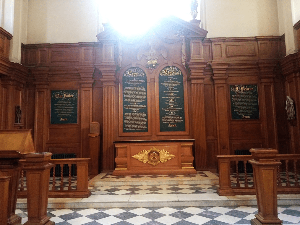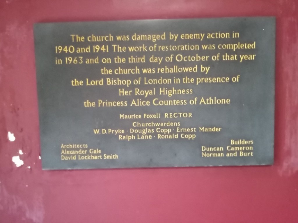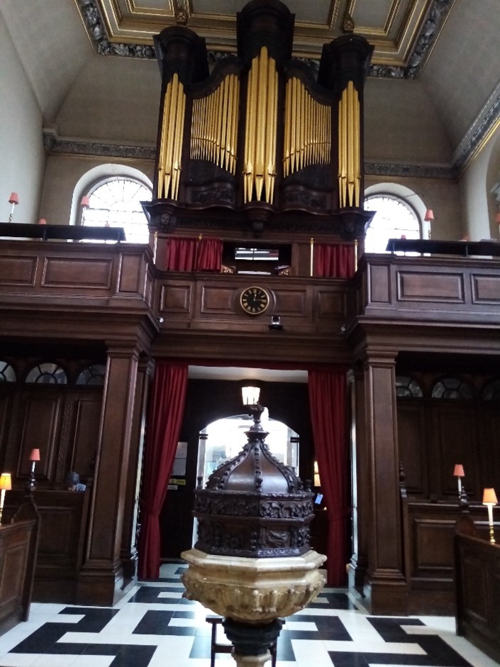 Vedast (Vaast in French) was a 6th century bishop of Arras in Gaul who helped to restore Christianity to the region after destruction by invading tribes. The church’s unusual name is because the Saint’s name in England has been corrupted from St Vaast into Vastes, Fastes, Faster, Fauster, Forster and finally, Foster, which shows how the English language has changed over time. It’s possible that the original church was founded by the Flemish community in London in the 12th century, but this is uncertain. St Vedast has suffered much damage over the centuries; extensive repairs to the 350-year-old church in 1662 were somewhat wasted as it was almost destroyed in the Great Fire four years later. It was rebuilt under Wren in 1670-73 but then gutted by firebombs in the London Blitz. The original plan was to leave the church as a roofless ruin, to serve as a war memorial, but this proposal was never carried out, instead the church was repaired. The church is situated on a busy junction near St Paul’s Cathedral, surrounded by the much taller buildings of the modern city, so the ‘open to the sky’ memorial would have been a lovely idea, perhaps becoming a garden church like St Dunstan’s in the East. The church does have a tiny courtyard for office workers to enjoy their lunch, but a leafy green garden would be nicer!