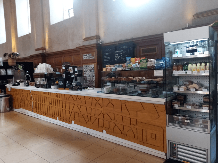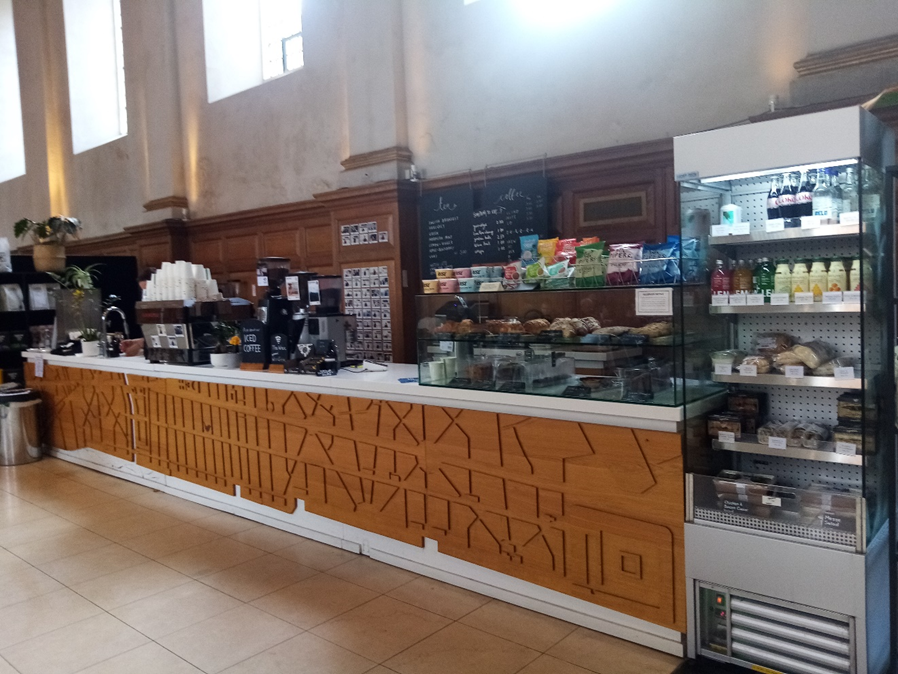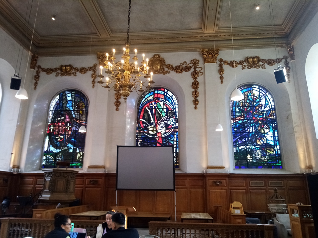 Just along Queen Victoria Street from St Andrew is St Nicholas Cole Abbey. So who is St Nicholas Cole, and was this church once an abbey? This is a misleading name; the church is dedicated to the 4th century St Nicholas of Myrna but ‘Cole Abbey’ is derived from ‘Coldharbour’, a medieval word meaning shelter from the cold for travellers and those seeking sanctuary. The original church was founded in about 1144, but I’m going to skip 900-odd years to focus on what’s been happening at St Nick’s Church (as it’s now known) this century. In 2006 the church was due to become a National Centre for Religious Education, promoting RE in schools, but this never happened, and the church closed. In 2014 the building reopened as the St Nicholas Cole Abbey Centre for Workplace Ministry, and in 2016 Sunday services resumed alongside midweek meetings. When I visited the church at about 11am on a Wednesday morning, I was greeted by the sight of a permanent coffee bar and sandwich shop along one wall, office workers seated at tables, and a bookshop. St Nick’s is a cafe Monday to Friday and also hosts ‘Christianity Explored’ courses and ‘Lunchtime Talks from the Bible’, as well as Sunday Services for a local congregation, including youth and children’s clubs. Another busy, thriving church in the City!