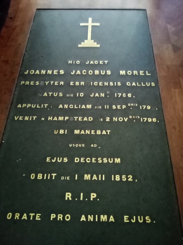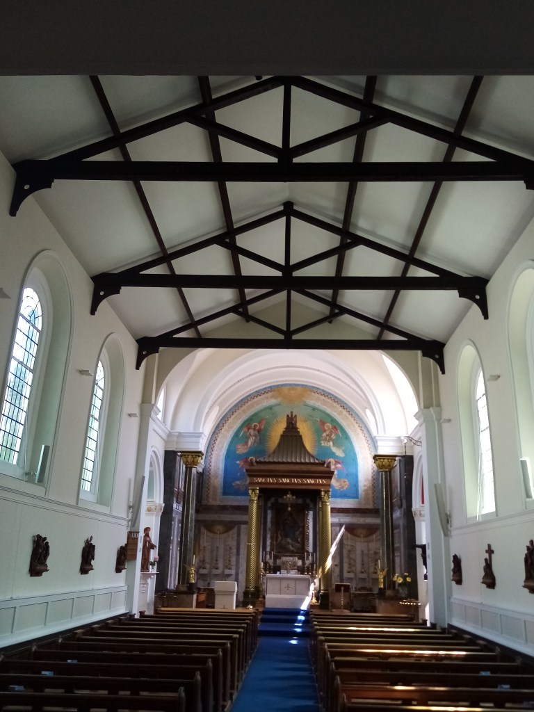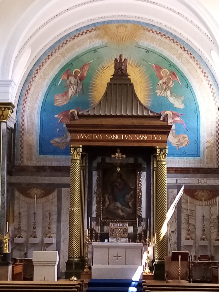 This pretty little church, formally a chapel, is located in Holly Place, part of a terrace of Georgian cottages and standing no taller than its neighbours, apart from the bell tower. The beautiful façade with bell tower and statue of the Virgin and Child, was designed by architect William Wardell. Originally the church had a plain frontage; the bell tower was added when the law was changed to allow bells to be rung from Catholic churches in 1852. St Mary’s was the first Catholic church to be established in Hampstead after the English Reformation in the 16th century. The first minister was a refugee from the French Revolution, who arrived in England in 1792. Abbe Jean Jacques Morel’s first role was to act as chaplain to the many French families in exile in the village. After the defeat of Napoleon and the return of the refugees to France, Abbe Morel accepted an offer by the many other Catholics living in the area to be the Parish Priest of a newly-built chapel dedicated to St Mary in 1816. He made education a priority and quickly established two schools, one each for boys and girls, supported by wealthy parishioners. The sanctuary of the church is beautifully decorated with tile mosaics; I like the contrast with the plain white walls.