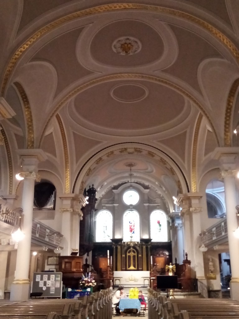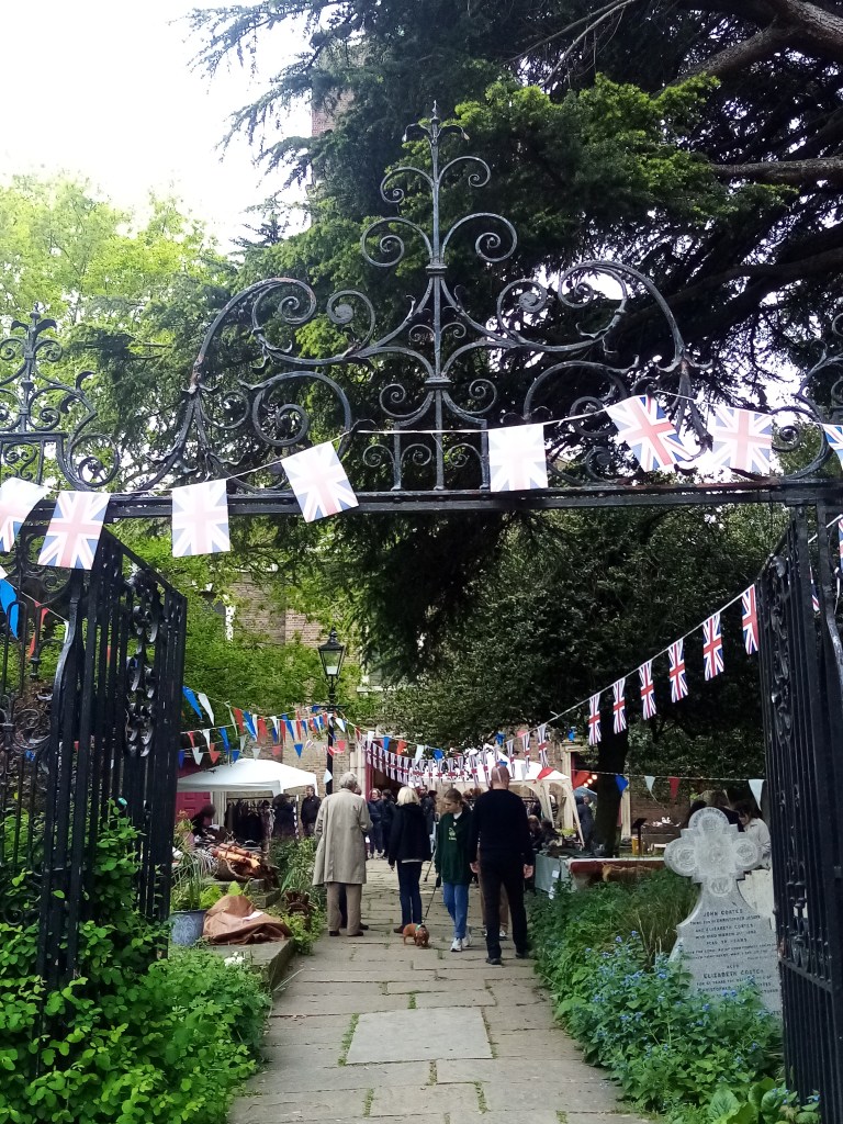This church is situated in Church Row, described as ‘the show piece of Hampstead’ Beautifully preserved Georgian houses line the street leading up to St John’s and its picturesque churchyard. The current building was completed in 1747 but the first record of a church on the site are from 1312. The original small church was replaced several times until in the early 1700s Hampstead grew in popularity as a fashionable, out of town health resort frequented by people who wanted to get out of the smoky, bustling city. The subsequent new-build of 1747 was again too small by 1827 as the population of London expanded outwards so it was extended, adding 524 seats. In 1871 plans were considered to demolish the tower as part of a ‘beautifying and improving’ project but this was protested by the likes of William Morris, Holman Hunt, Anthony Trollope and Ford Madox Brown among others, the glitterati of the day. I’m with them, I don’t see how knocking down a tower can improve a church! The churchyard is the final resting place of artist John Constable, architect George Gilbert Scott, comedian Peter Cook and Labour Party leader Hugh Gaitskell. I happened to visit on the public holiday for the King’s coronation and the church was open for festivities.
