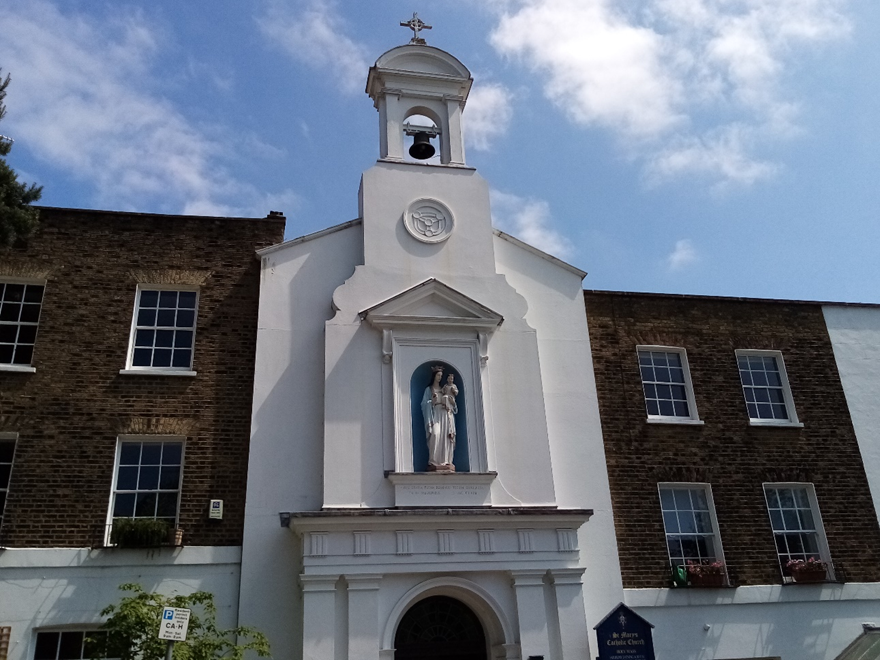 This pretty little church, formally a chapel, is located in Holly Place, part of a terrace of Georgian cottages and standing no taller than its neighbours, apart from the bell tower. The beautiful façade with bell tower and statue of the Virgin and Child, was designed by architect William Wardell. Originally the church had a plain frontage; the bell tower was added when the law was changed to allow bells to be rung from Catholic churches in 1852. St Mary’s was the first Catholic church to be established in Hampstead after the English Reformation in the 16th century. The first minister was a refugee from the French Revolution, who arrived in England in 1792. Abbe Jean Jacques Morel’s first role was to act as chaplain to the many French families in exile in the village. After the defeat of Napoleon and the return of the refugees to France, Abbe Morel accepted an offer by the many other Catholics living in the area to be the Parish Priest of a newly-built chapel dedicated to St Mary in 1816. He made education a priority and quickly established two schools, one each for boys and girls, supported by wealthy parishioners. The sanctuary of the church is beautifully decorated with tile mosaics; I like the contrast with the plain white walls.