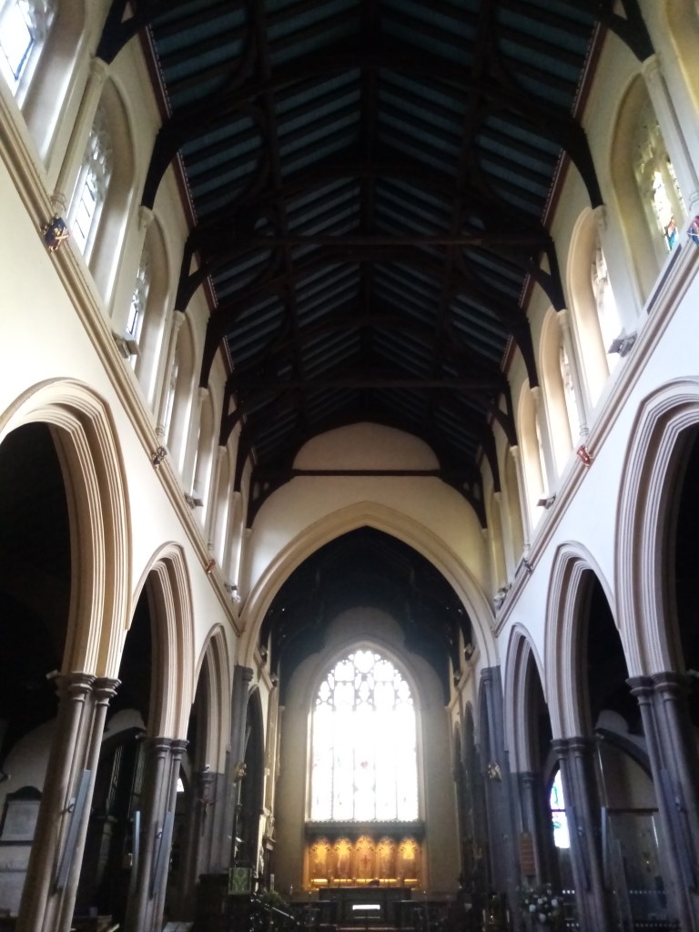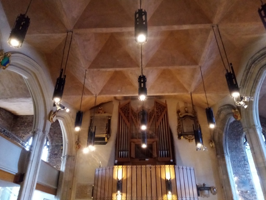 Putney Bridge is the only Thames bridge which has a church at both ends. Both St Mary’s, in Putney, and All Saints, in Fulham, have retained their almost identical 15th century towers, making them look confusingly similar from a viewpoint in the middle of the bridge. Looking back through my photos, I had to remember which tower was which! The first church on the St Mary site dates from the 12th century; the tower is the oldest remaining part of the church, which has been rebuilt several times. St Mary’s is famous for being the location of the Putney Debates of 1647: a series of discussions about the English Constitution following the success of the Parliamentarians in the English Civil War. One particular subject up for debate was whether political power should lie with a democratically elected parliament, rather than with the monarch! The interior of St Mary’s was substantially altered following a fire in 1973, after which the altar was repositioned halfway down the nave. The ceiling looks like its had a makeover too!