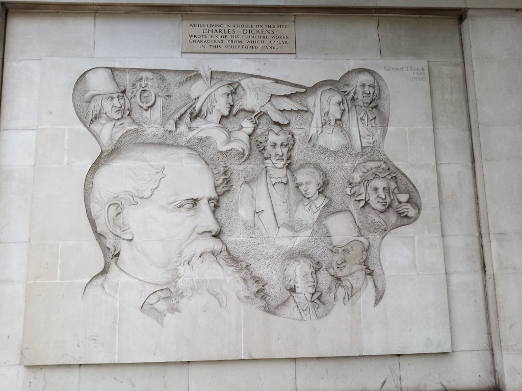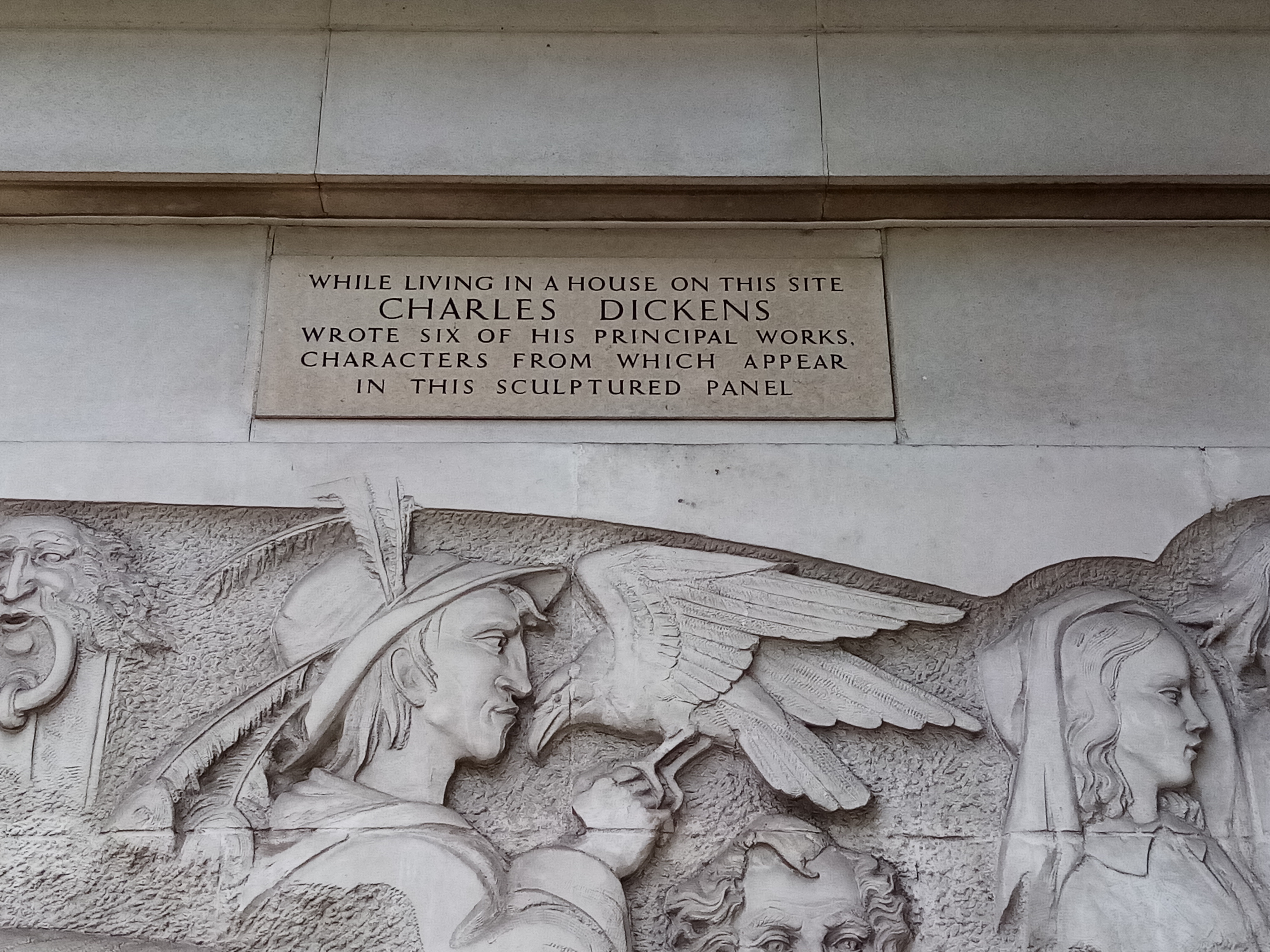Dickens lived from 1839 to 1891 in Devonshire Terrace, close to the Parish Church of St Marylebone. His own son was baptised here and he used his experience of the ceremony in his novel Dombey and Son for the baptism of baby Paul. The house that Dickens lived in no longer stands but a relief plaque was erected on the present building showing characters from the six works he wrote while living here: Scrooge, Barnaby Rudge, Little Nell and Granddad, Dombey and daughter, Mrs Gamp, David Copperfield, Mr Micawber. The large head is unmistakably Dickens himself.