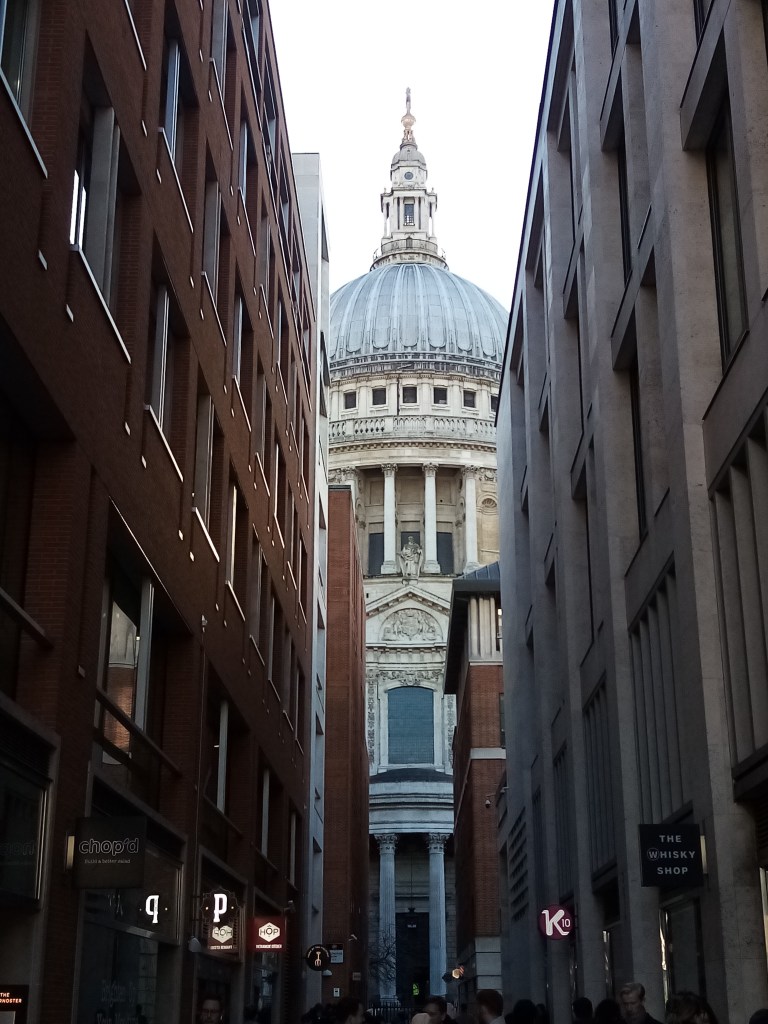 In Oliver Twist, Nancy hears the mournful bell of St Paul’s toll midnight on her way to meet Rose and Mr Brownlow on London Bridge. And in A Visit to Newgate, a magazine article in Dickens’ work Sketches by Boz, a condemned prisoner in Newgate Prison hears the bell strike one in the morning and knows he has only seven hours left to live. The second picture is one of my favourite views of St Paul’s; the modern buildings in this narrow alley have roughly the same footprint as they had in Dickens’ time, in fact, since mediaeval times.