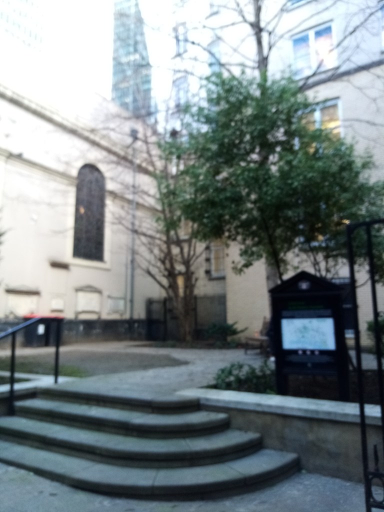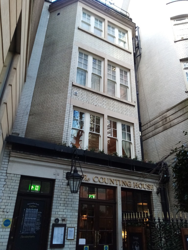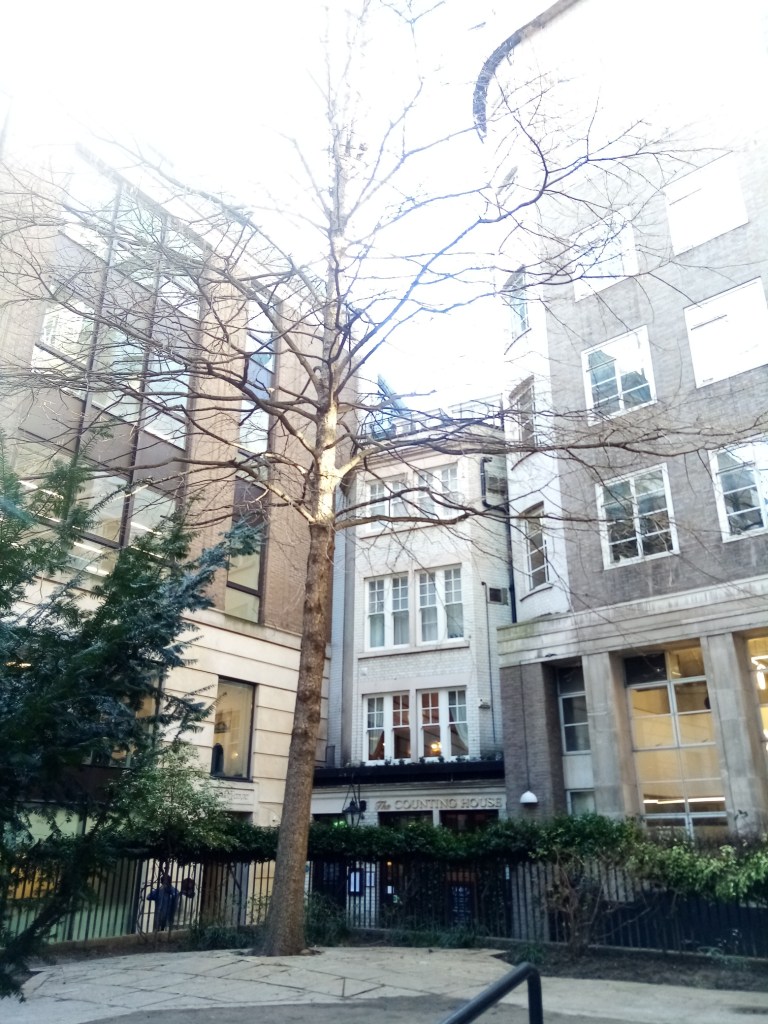 The first picture is of a side entrance to The Counting House in Cornhill, an opulent restaurant, bar and hotel just across the alley from the churchyard. I’ve tried to find out how it got its name without success, but I like to think that it could be the setting for Scrooge’s office, which is described in A Christmas Carol as a ‘counting-house’. The Ghost of Christmas Yet To Come leads Scrooge past his former office in a narrow court before reaching the churchyard, so that seems to fit. And lastly, a picture of the church surrounded by iron railings. The Spirit and Scrooge left the court and entered the churchyard through an iron gate, further evidence that this is the very place!