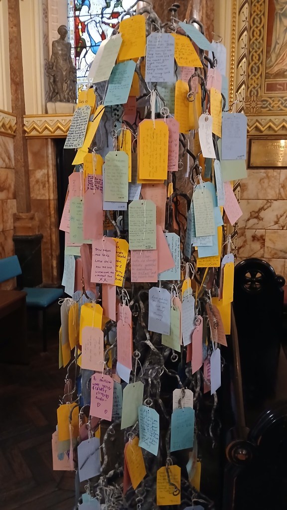 And lastly, this exquisite little chapel at the world famous GOSH. The original hospital was built between 1871 and 1876 and the chapel was completed in 1875. It was designed by Edward Barry who donated his work to the hospital in memory of one of his children who died in infancy. When the old hospital was demolished in the 1980s could not be pulled down due to its Grade ll listing. Instead the whole chapel was moved to its new site, GOSH’s new Variety Club Building, by encasing it in a huge waterproof box and using hydraulic rollers to transport it. All the furniture, fittings and the stained glass windows were removed prior to relocation of the chapel. Six years after it was moved, following extensive renovation the chapel was reopened on 14th February 1994 by Diana, Princess of Wales. The chapel is designed in the Franco-Italianate style and influenced by Renaissance Revival. Some of the stained-glass windows depict Bible stories relating to children: Jesus welcoming the children and the boy Samuel with Eli the Priest. I particularly liked the Prayer Tree which was commissioned to celebrate the chapel’s 140th anniversary. The chaplaincy team offers pastoral support regardless of religious belief and the chapel hosts daily prayers. It offers a quiet place for reflection and prayer for families and houses the poignant but beautiful Book of Remembrance.
