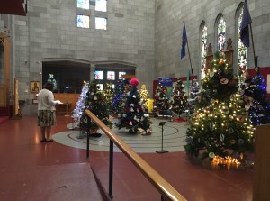 Back in Nelson, the sky threatens rain, so we walk up to the ‘modern gothic’ cathedral which is on a hill literally at the end of the main street. Inside there is an enchanting Christmas Tree display, there are dozens of them and it’s actually a Christmas Tree competition. The trees are decorated (or in some cases constructed) by local groups: businesses, charities, churches, the City Council, and young people’s groups: Sea Scouts, Guides, Youth Clubs and Schools. They are all amazing, so creative and all different. There are voting slips to vote for your three favourite trees, which we do, sadly we’ll never know which was the winning tree!