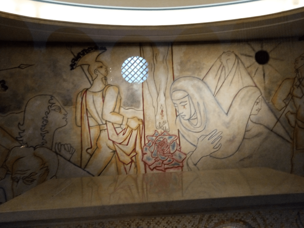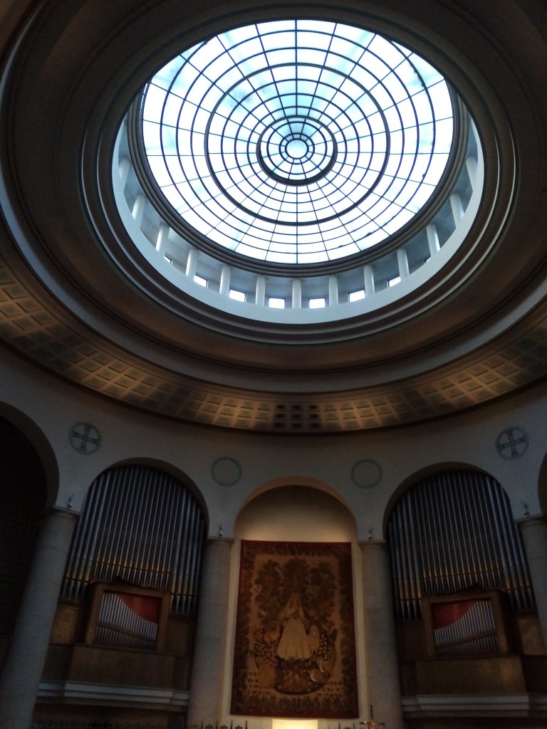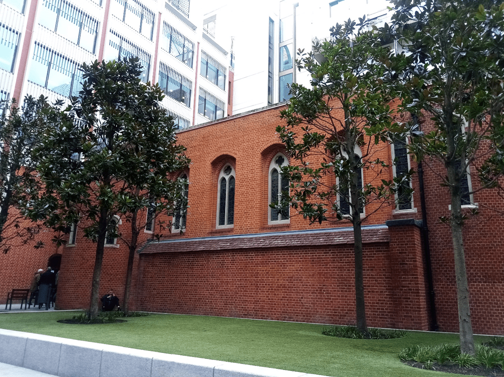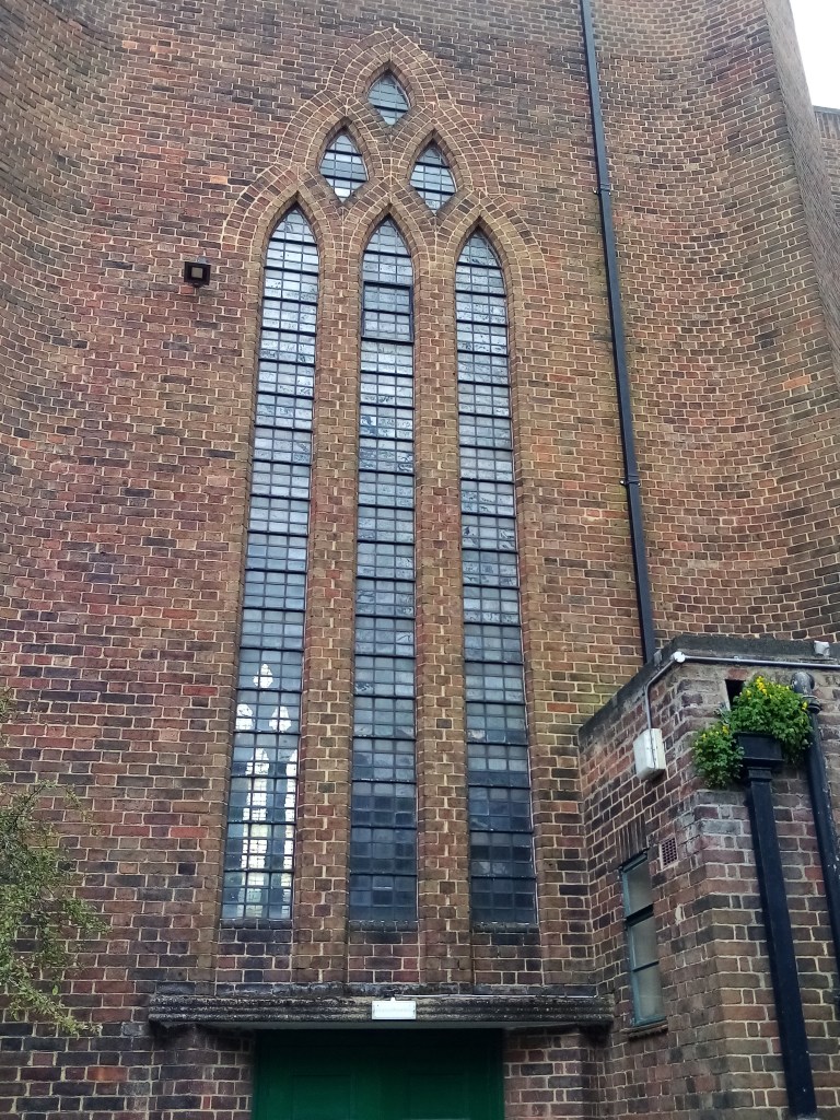 On the other side of Cheam Road, just outside the town centre, is the Baptist Church, built in 1934 in the ‘Arts and Crafts’ style. I thought that this late 19th/early 20th century movement referred to furnishings, room design and wallpaper, I didn’t realise it could apply to buildings. Trinity and the Baptist Church were built less than 30 years apart, but they couldn’t be more different. This building replaced a more ‘traditional’ style of church a little way down the High Street, which was bought by Mr Shinner who wanted to expand his shopping empire to create a department store. I think the picture below is rather sad: a big banner across the church building basically declaring that the church will have to ‘make way’ for progress and commerce. However, I do really like the ‘new’ building, built in red brick in the ‘Modern Gothic’ style. I love the detail over the doorway and the high windows in the main church, wish I could take a look inside! The church is a noted in the Heritage Department of the Borough for its cotemporary brick design, lots of sharp angles and varying surfaces. In its way, just as impressive as Trinity Church.