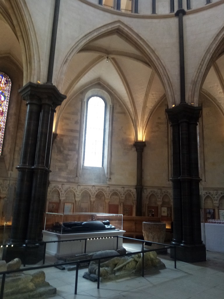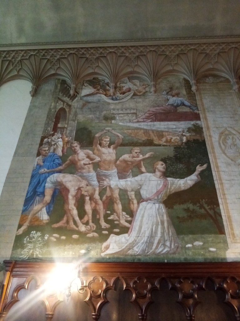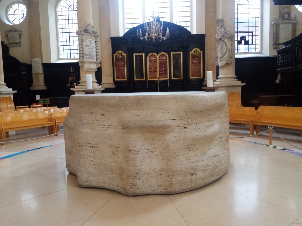 Still surrounded by its ancient churchyard, the present church was built in 1864 at a cost of £7,600, to accommodate the increase in population; the original mediaeval church was mentioned in the Domesday Book. The Revd Herbert Turner became the incumbent in 1866, two years after the building of the new church, and he was well known locally for his charitable work. He set up a committee of local tradesmen to provide dinners for 2,500 poor children during the winter months, and a ‘Clothing, Blanket and Boots’ club for the poor. The church continues its work in the community by being the HQ of the Sutton Street Pastors who go out from here on Fridays and Saturdays to engage with the people of Sutton. They have developed a good relationship with rough sleepers, some of whom ‘live’ in the churchyard. On the North side of the church the windows are plain glass instead of stained-glass as a reminder of the bomb which landed and exploded in the churchyard on the night of 24th September 1940. All the windows on this side were blown out, but this was the only significant damage to the church. In the churchyard stands the Gibson Mausoleum which was built in 1777, containing the remains of James Gibson, a London wine merchant and his family, paid for by his eldest daughter Mary. Both her parents died in 1776 and Mary used some of her inheritance to pay for them to be interred here instead of in the churchyard. Inside are 2 hexagonal sarcophagi and 5 hexagonal wooden coffins, all extended family of James Gibson. The tomb opens for annual inspection on August 12th and last year a distant relative from America attended the ceremony. One of the church’s treasures is the original small mediaeval font, rescued from the original church.