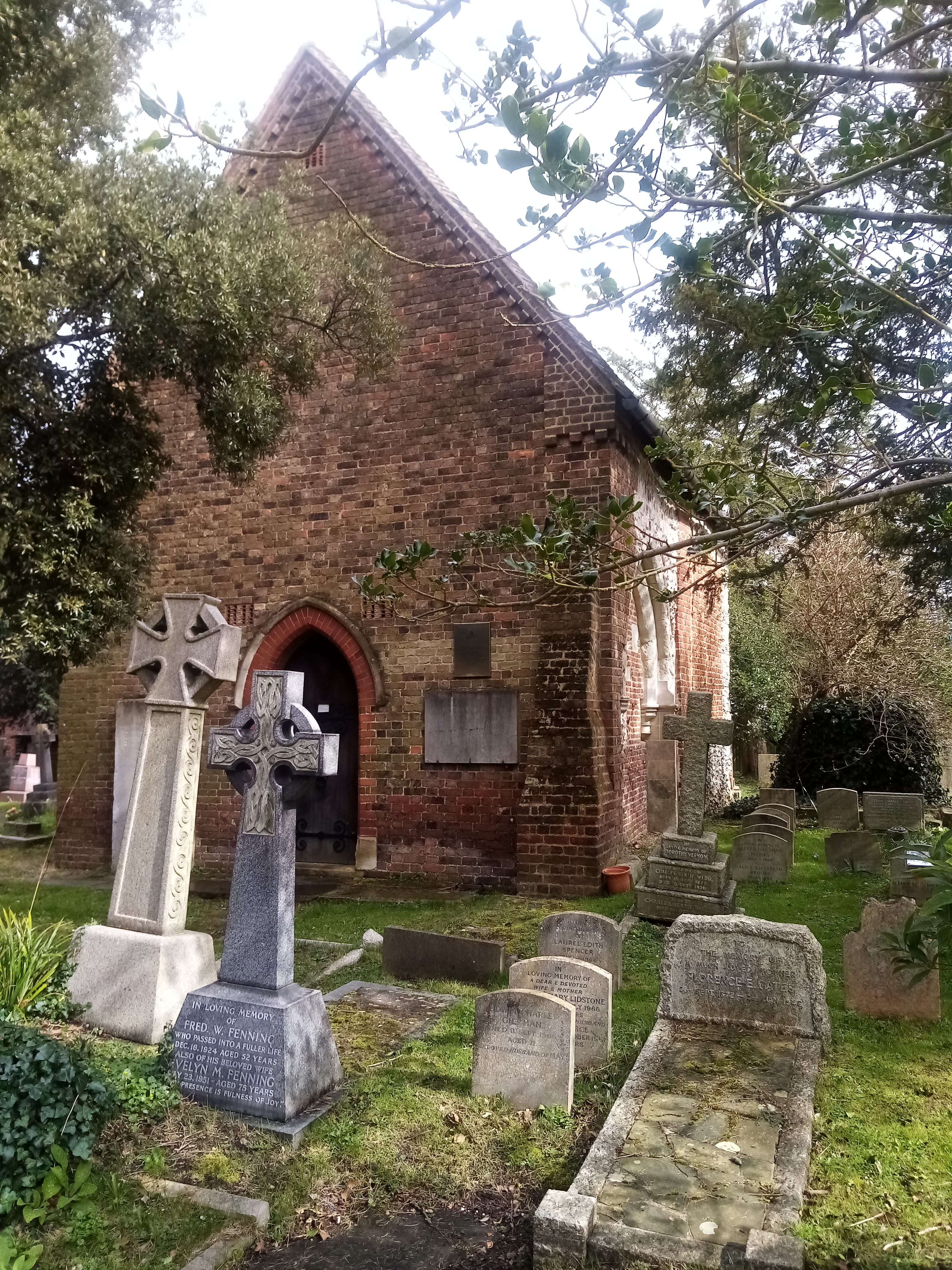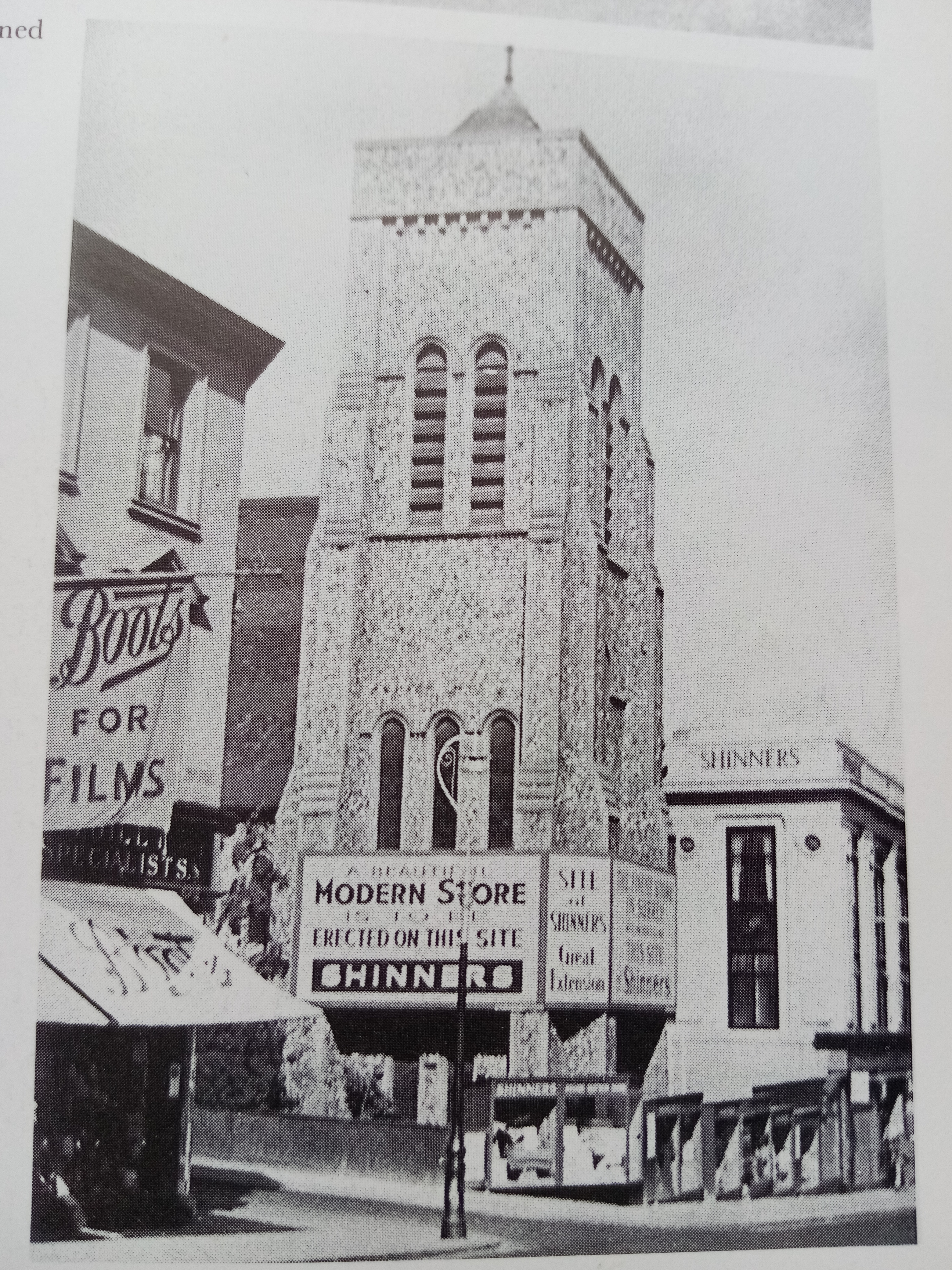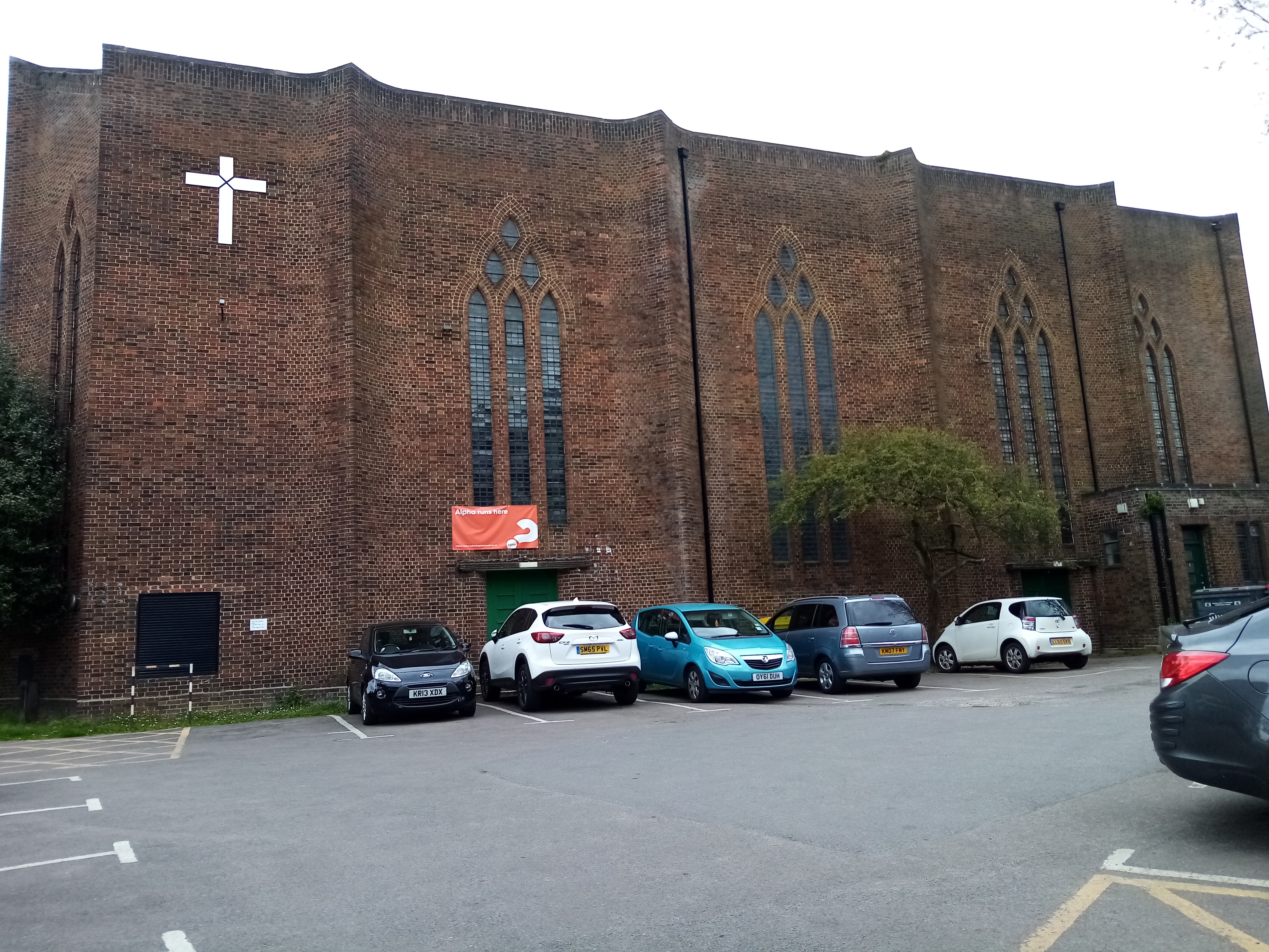 On the other side of Cheam Road, just outside the town centre, is the Baptist Church, built in 1934 in the ‘Arts and Crafts’ style. I thought that this late 19th/early 20th century movement referred to furnishings, room design and wallpaper, I didn’t realise it could apply to buildings. Trinity and the Baptist Church were built less than 30 years apart, but they couldn’t be more different. This building replaced a more ‘traditional’ style of church a little way down the High Street, which was bought by Mr Shinner who wanted to expand his shopping empire to create a department store. I think the picture below is rather sad: a big banner across the church building basically declaring that the church will have to ‘make way’ for progress and commerce. However, I do really like the ‘new’ building, built in red brick in the ‘Modern Gothic’ style. I love the detail over the doorway and the high windows in the main church, wish I could take a look inside! The church is a noted in the Heritage Department of the Borough for its cotemporary brick design, lots of sharp angles and varying surfaces. In its way, just as impressive as Trinity Church.