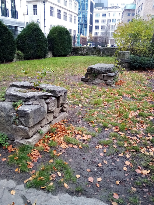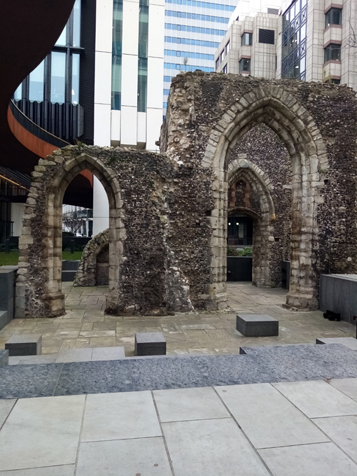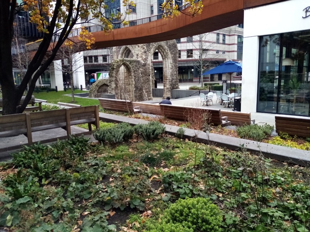 I actually thought that this garden and St John’s Priory Garden were the same place; in fact both were part of the medieval precincts of St John’s Priory which covered a large area of Clerkenwell. This garden is a former burial ground used mainly for the burial of the poor, which was later converted into a Victorian ornamental garden. During the intervening years between closure of the burial ground in 1854 and conversion to a public garden in 1870, the area was used as ‘a sort of waste ground on which pots and pans and refuse of all kinds, were flung from the neighbouring houses.’ Clerkenwell was a particularly deprived area of the City and the garden was intended to provide ‘a nook of greenery in this dingy and squalid part of London, where the workman may smoke his pipe in the dinner hour and feeble folk rest and chat in the summer sunshine.’ Today the garden is a designated Site of Importance for Nature Conservation, with year-round pollinating plants, bird boxes and bug hotels. When I visited there were office workers, construction workers and some retirees enjoying the spring sunshine – its original purpose lives on!